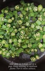 Add the paste to the skillet with curry leaves, add water as instructed with Tamarind and Jaggery. After 10 mins on low flame, add the Okra.